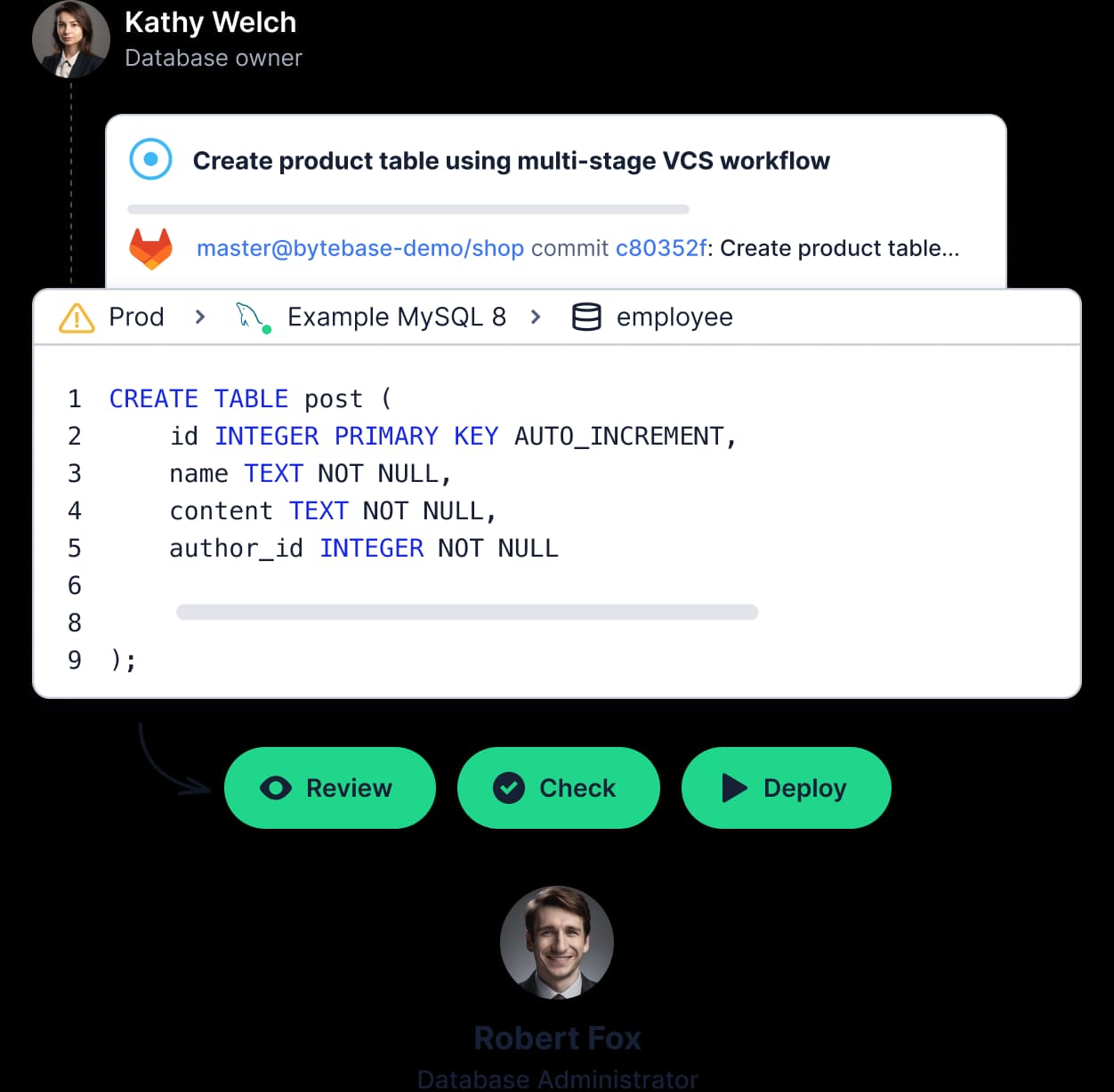 Bytebase streamlines database change deployment from non-prod to prod with review workflow, rollback, and optional GitOps integration.
